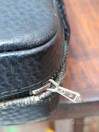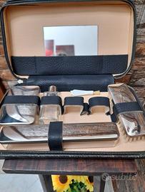 set uomo anni 60 da viaggio con specchio porta saponetta porta spazzolino spazzola per abbiti una boccettina in vetro e un piccolo pennello mancano un'altra boccettina pennello per barba,tutto integro borsetta in pelle con cerniera integra con qualche punto fi usura