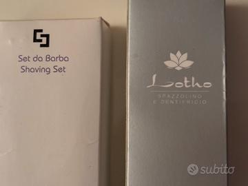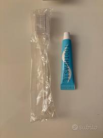 SET DA VIAGGIO:1 kit per la rasatura della barba o gambe/ascelle UNISEX NUOVI E MAI APERTO DALLA CONFEZIONE IN PLASTICA TRASPARENTE (rasoio a 2 lame senza sapone sopra ma + la schiuma da barba da 10 ml prodotta in Italia:scritto dietro il tubetto) e 1 kit con spazzolino e cappuccio per spazzolino e dentifricio UNISEX NUOVI E SPAZZOLINO E DENTIFRICIO SIGILLATI (dentifricio da 7 ml,prodotti in Italia:scritto sul retro del tubetto del dentifricio),Utili da viaggio nuovi e confezionati e perfetti per le vacanze o un week end o viaggi di lavoro o da tenere in borsa/auto per necessità.