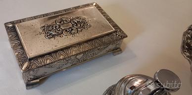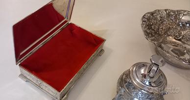 - Scatola decorata in stile antico, in metallo argentato, presenta decorazioni in rilievo con motivi floreali e geometrici.