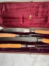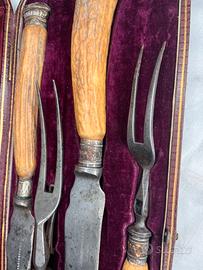 Elegante set di utensili da cucina vintage, perfetto per collezionisti di antiquariato - Manici in legno lavorato con dettagli. - Lame in metallo resistenti. - Include coltelli e forchette per servire.