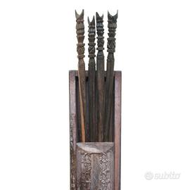 Set vintage di BACCHETTE TRADIZIONALI BALINESI intagliate a mano in legno massello "Wind Song" con scatola portaoggetti. €32Bacchette vintage in legno intagliate a mano con testa di animale, 4 paia. Set vintage di 8 bacchette in legno intagliate a mano con animali che sembrano perline. Misurano 9,5" di lunghezza con un paio che sono più corte (circa 8"). Ottime condizioni vintage, come mostrato nelle foto.