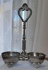 Splendido set di ampolle per olio e aceto, in vetro e peltro 95%, degli anni 40/50, ideale per aggiungere un tocco di classe vintage alla tavola o come pezzo da collezione. Materiali: Le due bottiglie sono in vetro trasparente con un raffinato motivo a rombi (trapuntato), complete di tappi in vetro. Il supporto e le basi sono in peltro 95% con manico decorativo a forma di cuore e piedini lavorati. Condizioni: L'oggetto è in ottime condizioni, come mostrato nelle immagini. Non é stato lucidato per non togliere quella classica patina di antico. Sono presenti punti di ossidazione all'interno dei due contenitori per le ampolle. Provenienza: oggetto di famiglia Dimensioni contenitore in peltro: lunghezza 17 cm; altezza 22.5 cm Dimensioni di ciascuna ampolla: altezza con tappo 16 cm; larghezza massima a livello dei rombi 6 cm Ciascuna ampolla può contenere circa 150 ml di liquido