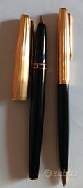Cofanetto composto da una penna stilografica e una penna a sfera vintage "Aurora 98 Doblone" in buone condizioni. Corpo in plastica nera e parte superiore in placcato oro laminato 22 k. Lunghezza: 135 mm. Peso di entrambe: 35 gr. Meccanismo a scatto. Penna a sfera con ricarica ancora funzionante. Scatola originale in legno con superiormente tessuto vellutato rosso e una moneta " Carolus.v. rom. Imp." L'interno della scatola è rivestito in tessuto lucido rosso con moneta " Carolus.v. rom. Imp.".