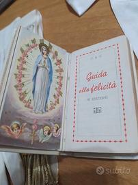 Guanti bianchi in tessuto. Stola decorata con ricami floreali e frange dorate. Piccolo libro Guida alla Felicità c.d.g. XI edizione. Fiocco bianco in raso. Fazzoletto ricamato con calice. Medaglia ricordo con nastro azzurro.
