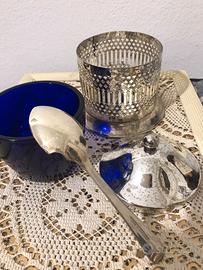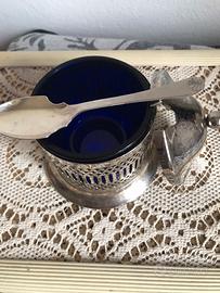 Elegante set vintage composto da zuccheriera, saliera o contenitore per senape made in England. Realizzato in metallo argentato (forse placcato argento) e vetro blu cobalto.