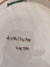 COPPIA PIATTI SOLE & LUNA CERAMICA ARTISTICA VIETRI Rari piatti decorativi (NR.2) in ceramica smaltata e dipinta a mano, realizzati artigianalmente dalla storica manifattura "Ceramiche Avallone" di Vietri sul Mare. I piatti presentano un vivace decoro centrale giallo rappresentante uno il sole e uno la luna contornato con bordatura in blu cobalto, Lo stile ed i colori sono tipicamente vietrese e richiama l’arte popolare mediterranea della seconda metà del Novecento. Le Ceramiche Avallone sono una delle botteghe storiche di Vietri sul Mare, attiva sin dal primo Novecento. Famosa per le decorazioni vivaci, i soggetti naïf e i colori brillanti, la produzione Avallone rappresenta una parte fondamentale della tradizione ceramica vietrese ed è oggi molto apprezzata dai collezionisti di ceramica artistica italiana. Piatti da muro perfetti come pezzi da collezione, arredi da parete o elementi decorativi per ambienti dal gusto mediterraneo. Caratteristiche tecniche Manifattura: Ceramiche artistiche Avallone, Vietri sul Mare Epoca: Anni ’70-'80 Tecnica: Ceramica smaltata e dipinta a mano Firma: Presente sul retro (Avallone Vietri) Dimensioni: diametro 25 cm. Spessore: 3 cm. con gancio posteriore per appenderli a muro. Condizioni: Nuovi