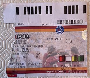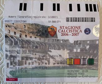 Lotto Biglietti AS Roma - Coppa Italia (2005-2008) Serie di biglietti originali relativi a diverse edizioni della Coppa Italia (TIM Cup) disputate allo Stadio Olimpico. Il lotto include i tagliandi delle stagioni in cui la Roma ha alzato il trofeo. 🗓 Stagione 2004-2005 Roma vs Udinese • Data: 11 maggio 2005 (Semifinale Ritorno) • Risultato: 1 - 1 (Cassano) 🗓 Stagione 2005-2006 Roma vs Palermo • Data: 12 aprile 2006 (Semifinale Ritorno) • Risultato: 1 - 0 (Tommasi) 🗓 Stagione 2006-2007 (🏆 ROMA VINCITRICE COPPA ITALIA) Roma vs Parma • Data: 10 gennaio 2007 (Ottavi Ritorno) | Risultato: 2 - 1 (Doppietta Totti) Roma vs Milan • Data: 31 gennaio 2007 (Semifinale Ritorno) | Risultato: 3 - 1 (Mancini, Perrotta, Pizarro) Roma vs Inter • Data: 9 maggio 2007 (FINALE Andata) | Risultato: 6 - 2 (Totti, De Rossi, Perrotta, Mancini, Doppietta Panucci) • Nota: Storica vittoria che ipotecò il titolo vinto poi a San Siro il 17/05/2007. 🗓 Stagione 2007-2008 (🏆 ROMA VINCITRICE COPPA ITALIA) Roma vs Torino • Data: 16 gennaio 2008 (Ottavi Ritorno) | Risultato: 4 - 0 (Mancini, Doppietta Totti, Giuly) Roma vs Sampdoria • Data: 29 gennaio 2008 (Quarti Ritorno) | Risultato: 1 - 0 (Mancini) • Nota: Percorso che portò alla vittoria della seconda Coppa Italia consecutiva nella finale secca del 24/05/2008. • Settore: Prevalentemente Curva Sud. • Stato: Usati, originali dell'epoca. Stampa termica ancora ben leggibile