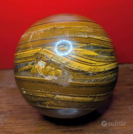 Vendo bellissima sfera massiccia di occhio di tigre proveniente dalla Cina, famosa per il suo aspetto a bande parallele e i suoi riflessi luminosi. Diametro: 7,5 centimetri. Peso: 655 grammi. Ritiro a mano a Firenze o spedizione.