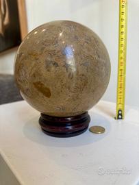 Sfera in fossilifera 14cm con base in legno. Vendo grande sfera in pietra fossilifera lucidato (diametro 14 cm), con bellissime inclusioni fossili naturali. Oggetto unico e decorativo, ideale per collezionisti o come pezzo d’arredo elegante.