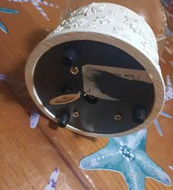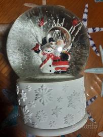 Sfera natalizia con palla di vetro effetto neve e musicale; attivando il carillon manuale suona la canzone ' jingle bells '; tema Babbo Natale e Pupazzo di Neve con pettirossi / Santa Claus & Frosty the snowman; nuovo (* senza scatola originale ). Dimensione grande: h. 14 cm x 11 cm.