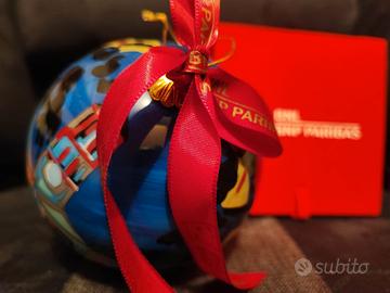 Sfera /palla natalizia in vetro opaline dipinto a mano. Collezione BNL, anno 2022. Il tema rappresentato è "Alba in Trastevere” ispirato all’opera omonima di Titina Maselli. Misura diametro 11 cm (maxi).