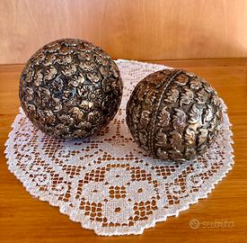Due sfere in metallo invecchiato, con decorazioni a sbalzo che rappresentano elefantini in rilievo.
