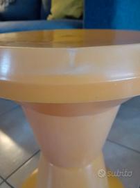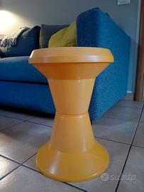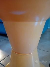 Sgabello modello "Diablo" prodotto in Italia negli anni '70 dall'azienda Giganplast. Un'icona del design Space Age di quel decennio, caratterizzato da linee essenziali e materiali innovativi per l'epoca. Lo sgabello è realizzato in plastica stampata resistente e presenta la sua inconfondibile forma a clessidra, che non solo gli conferisce stabilità ma anche un aspetto minimalista e di grande impatto visivo. È composto da due elementi incastrati tra loro, oltre alla seduta superiore, rendendolo versatile e facile da smontare e riporre. Le sue dimensioni standard, tipiche del modello, lo rendono adatto come seduta aggiuntiva o come tavolino d'appoggio. La colorazione di questo esemplare è in linea con le tendenze cromatiche dell'epoca: la struttura principale è in color arancio. La seduta funge anche da coperchio rimovibile. Il marchio "GIGANPLAST - MADE ITALY" è impresso in rilievo sul lato interno della base, a conferma dell'autenticità e dell'origine italiana del pezzo, che testimonia un momento storico di grande fermento nel design industriale. È perfetto come sgabello aggiuntivo, comodino originale o come elemento decorativo in qualsiasi ambiente moderno o vintage. Ottime condizioni generali, ovviamente data l'età può avere piccoli segni dati dal tempo e dall'uso come piccole tracce di scoloritura, qualche segno dato dall'uso etc. Dimensioni: 44 x 30 cm. Sono disponibili altre foto.