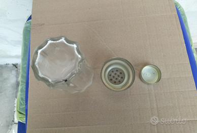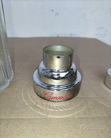vecchio boston shaker mixer di vetro pubblicitario vintage del noto marchio italiano aperitivo campari milano con tappo in alluminio colore cromato con scritta in rilievo del classico colore rosso
