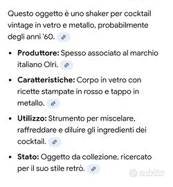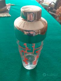 SHAKER MISCELATORE PER COCKTAIL ANNI 60/70 IN VETRO. PRESENTE SUL CORPO DELLO SHAKER SCRITTE SERIGRAFATE IN ROSSO CHE INDICANO IL DOSAGGIO E IL NOME DI ALCUNI COCKTAIL PIÙ CONOSCIUTI COME IL MARTINI, L' ALEXANDER E IL MANHATTAN.