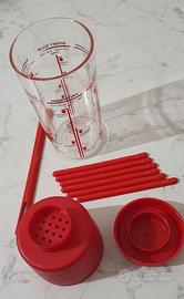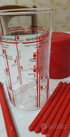 Sul corpo dello shaker sono stampate ricette per cocktail come il Whisky Sour e il Grasshopper, con indicazioni per le dosi.