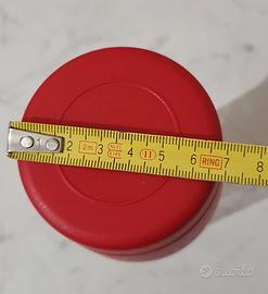 È realizzato in plastica trasparente con un tappo rosso.