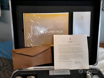 Il gruppo Dura - Ace e il mod. Top della gamma Shimano, mi stato introdotto dai Giapponesi nel 1973. Nel 1998 l'azienda Shimano per il loro 25° anniversario dalla fondazione ha rilasciato una serie limitata e numerata del gruppo. I componenti si basano sul modello Dura-Ace 7700 del 1999, ma ci sono delle differenze significative, le superfici dei componenti sono state lucidate a mano, in alluminio spazzolato e titanio impreziosita da una confezione lussuosa, nuovissimo, mai aperto, immacolato, racchiuso in un'elegante valigia. La confezione include un fantastico orologio Seiko automatico in acciaio inox, con cinturino in pelle, il quadrante personalizzato con le scritte Shimano Dura-Ace.
