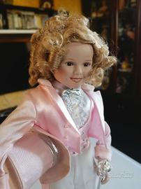 Questa bambola di porcellana Danbury Mint è una meravigliosa aggiunta alla tua collezione. Con i capelli biondi e ricci e gli occhi marroni, questa bambola di Shirley Temple, chiamata "Dimples", è dotata del suo bastone e del suo cilindro. La bambola è in ottime condizioni di esposizione, purtroppo, le manca un pezzettino di ditino, sennò costerebbe il doppio, ha il costume di scena come in uno dei suoi films. Il set include la bambola stessa, il suo supporto, così come il suo cilindro e il suo bastone, rendendolo perfetto per qualsiasi collezionista o fan di Shirley Temple. Non perdere l'opportunità di avere questa bellissima bambola nella tua collezione.