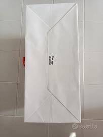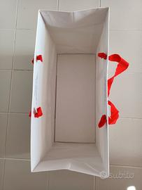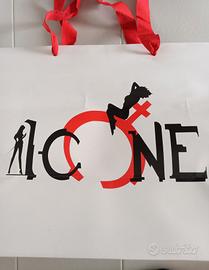 Shopper di cartone resistente bianco con scritta rosso/nero ICONE, con manico in tessuto rosso e base rettangolare. Sono residui di negozio, nuove, misure shopper 40x30, base 40x18, lunghezza manico 75cm regolabile, larghezza manico 2,5cm. Quantità disponibile 140pz. Contattare tramite subito.