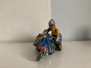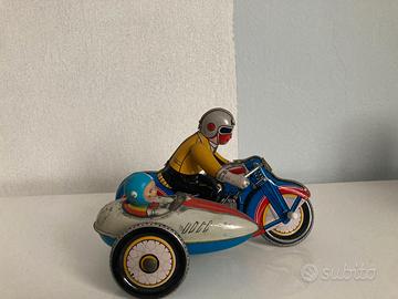 Moto di latta d'epoca con copilota e chiave.