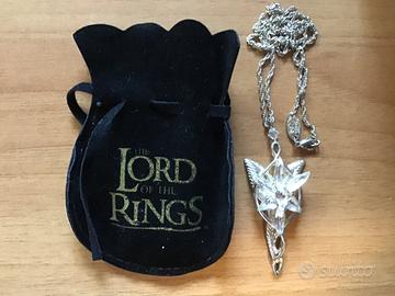 Replica da collezione della collana di Arowen - Stella del Vespro. La collana non è mai stata indossata, ma conservata per collezione nel suo sacchetto di velluto all’interno della confezione originale. La collana con ciondolo è in metallo placcato argento e cristalli ed è una riproduzione in scala 1:1. L’oggetto in vendita è quello mostrato in foto con scatola tematizzata con mappa della Terra di Mezzo, sacchetto in velluto con logo LOTR, collana e pendente e certificato di autenticità della New Line Cinema. #idearegalo