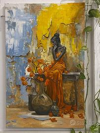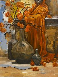 Le texture ricche e i dettagli pittorici donano profondità e carattere all’opera, mentre gli elementi decorativi – il vaso e i fiori – aggiungono armonia e poesia alla composizione.