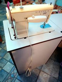 MACCHINA CUCIRE SINGER 267 a pedale, originale anni '70 funzionante, completa di mobile in legno a scomparsa dal raro colore avorio in eccellente stato di conservazione. Apertura a ribalta, sportello frontale, cassettino portaoggetti e manuale d'uso. Con cavo e lampadina per illuminare il piano lavoro.