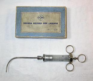 Contatti prego Tel. Voce : 333 - 4402586. Siringa da Laringe anni 1940 - 50 oggetto storico della Sanità, il pistone scorre bene, vetro perfetto, con il suo astuccio originale, usata prevalentemente negli ambienti Militari. Cedo con formula Visto e Gradito. Prego no messaggini, soltanto telefono Voce, grazie.