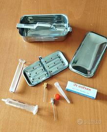 Coppia di siringhe in vetro per punture, complete di accessori e contenitore in metallo per la sterilizzazione in acqua bollente.