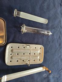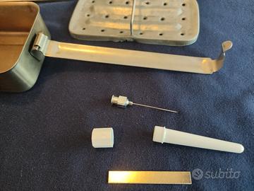 Siringa in vetro con scatolina, ago e accessori in metallo, originale anni '60.