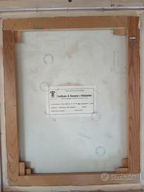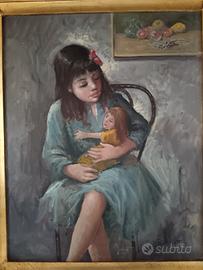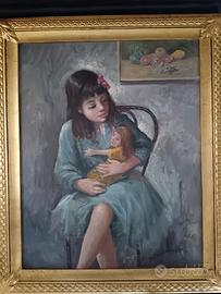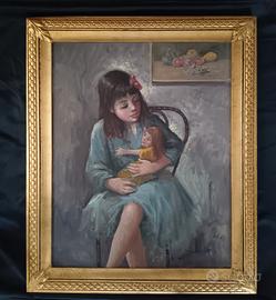 Elegante dipinto originale ad olio su tela firmato Sirio De Benedettis, raffigurante una dolce scena di fanciulla con bambola. Opera di gusto figurativo tipico della scuola napoletana del secondo Novecento, caratterizzata da toni delicati e atmosfera intima. Firmato in basso a destra Dimensioni tela: 40 x 50 cm Dimensioni con cornice: 61 x 51 cm Certificato di garanzia presente sul retro Cornice in legno dorata inclusa