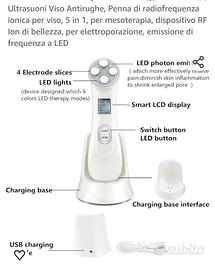 RADIOFREQUENZA ANTIRUGHE - ANTIETÀ IONICA - LIFTING VISO- IDRATAZIONE PROFONDA - PULIZIA=> 5 in 1 - PER UNA PERFETTA e EFFICACISSIMA SKINCARE. DISPOSITIVO x Cura Viso Antiinvecchiamento, Penetrazione profonda! FACIAL LIFTING MACHINE - SKIN CARE FACIAL CLEANER. Nutre in profondità la pelle del viso; Uniforma la trama della pelle del viso, la rende liscia ed omogenea e ha effetto di LIFTING. NUTRE la pelle del viso attraverso Ioni e ultrasuoni, che penetrano in profondità nel Derma, NUTRENDO IN PROFONDITÁ con eventuale uso della crema usata tutti i giorni. Ottimo ANTIRUGHE! Rimuove Acne e macchie scure dal viso che appaiono con il passare degli anni. Dispositivo emette Ioni per la CURA PROFESSIONALE del viso, da effettuare comodamente a Casa propria, senza dover recarsi dall' Estetista ed evitare così costosissimi trattamenti di Bellezza Antirughe, Anti-Età, nonché altri trattamenti al viso. NO AGHI! Dispone di 5 colori diversi, con regolazione della potenza da usare e tramite pulsante per le esigenze diverse della pelle ed uso per ogni necessità di cui il proprio viso ha miratamente bisogno. Diversi Programmi da impostare con la MASSIMA facilità, con risultato soddisfacente e soprattutto semplice e comodo da usare anche e soprattutto in casa propria . Lo si può facilmente usare per far penetrare al meglio la crema viso, oppure usare anche senza l'uso di creme.