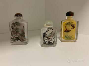 Vendo in blocco 3 bottigliette in cristallo di rocca dipinte a mano dall'interno, condizioni perfette raffiguranti scene con vari animali e piante.