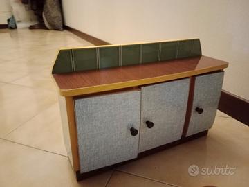 bellissimo soggiorno per bambole anni 60, artigianale, in legno massello e formica, vetri scorrevoli e smerigliati. misure credenza centrale sotto e sopra, h 40 lunghezza 35 profondità 12. credenza di sinistra solo sotto lunghezza 37 altezza 25. credenza con vetri lunghezza 29 altezza 20. appendiabiti con specchio altezza cm 30 larghezza cm 27. tavolo lunghezza 32, larghezza 22 altezza 19 cm