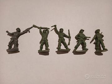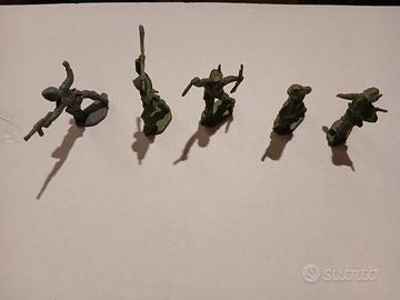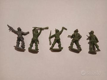 Vecchi soldatini in plastica alpini. Di colore verde, tranne uno di colore grigio.
