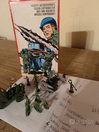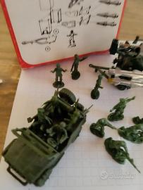 lotto SOLDATINI ATLANTIC SCALA HO, Serie EXPORT 121 composto da batteria missili (completa colorata)+ 5 artiglieri + scatola 121 in buono stato + Jeep comando completa (manca solo antenna) + 5 bersaglieri. Tutto originale anni settanta.