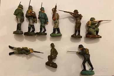 9 soldatini in pasta prodotti in Germania anni 30/40.Particolare è l'ufficiale in ginocchio probabilmente d'artiglieria. Di marca conosciuta il soldato sparante a terra che è uguale come fattura a quelli Elastolin.