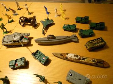I mezzi da guerra sono prevalentemente in plastica. La camionetta con uomini e il portaelicotteri sono Matchbox in metallo (solo questo è in vendita a 20€)
