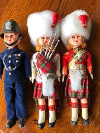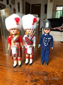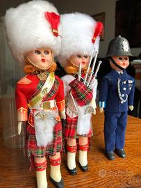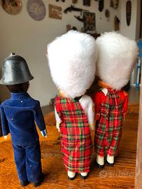 riproduzioni di soldatini in plastica, con vestiti di panno, acquistati a Londra anni 60 ben conservati, tranne le custodie di plastica trasparente un po' scassate. altezza circa 15 cm .