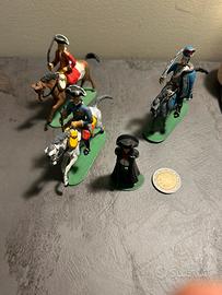 Vendo bellissimo gruppo di 4 soldatini d’epoca in zama, dipinti a mano negli anni ’70, marchiati “Equisit” e “Peltro/Zama lavorato a mano”.