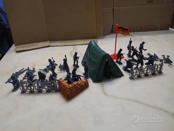 Soldatini Tedeschi di plastica colore grigio pezzi 24 più accessori 1 tenda 1 bandiera 4 barriere totale 30 pezzi vintage anni 80