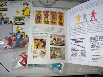 3 differenti bustine soldatini giocattolo in plastica contenuto in bustina con differente disegno e numero (1-2-3) più catalogo formato A5, 4 facciate, dedicato ai giocattoli di tex willer anni 60 70 (ACTION FIGURE BARAVELLI, GIOCO IN SCATOLA CLEMENTONI, FULICE MOLGORA, BI-PUZZLE)