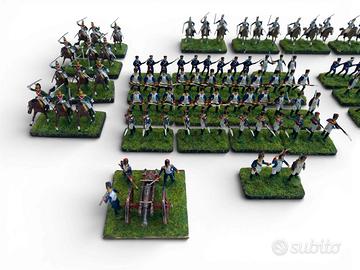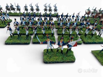 Lotto di soldatini in plastica scala 1/72 (brand storico ESCI), tema Guerre Napoleoniche. Tutte le miniature sono state interamente dipinte a mano con cura e precisione, montate su basette scenografiche con erba sintetica, pronte per essere schierate in diorama o utilizzate per wargames (regolamenti come Black Powder, Waterloo o Lasalle).