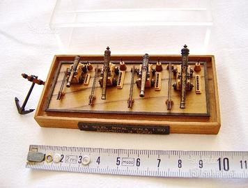 Di pregevolissima manifattura ed estremamente particolareggiate, tutte le sovrastrutture del vascello sono costruite integralmente a mano con materiali pregiati (ebano, bosso, mogano, noce, tek, foglie d'oro, ottone dorato o brunito, ecc.) lasciati al naturale per un risultato cromatico molto elegante. L'opera è completa in ogni sua sovrastruttura: gli accessori del ponte, le manovre e le scialuppe corredate di scalette, sassole, remi e porta-remi; le 3 lampade a forma ottagonale sbieca; tutti i bozzelli (oltre 2613, di 21 tipi diversi); le serie complete dei pagliolati in ebano; i 28 arganelli di 3 misure; scale e scalette; i 5 argani; i 16 tacchetti; le ancore, gli arpioni, le botti, i secchielli e le casse per viveri; la serie completa di 108 cannoni in 4 calibri, con palle allineate nel porta-palle, cuneo ed aste scovoli nel porta-scovoli; l'alberatura, già completa di coffe e parte del sartiame; tutti i fregi, le decorazioni e le sculture tridimensionali, intagliate a mano, ecc. Per completare l'opera, esclusiva nella sua perfezione tecnica e raffinatezza estetica, sono necessari solo costruzione dello scafo e confezionamento del velame. Documentazione a corredo, piani costruttivi de Le Soleil Royal edizione Mantua Model - Sergal Modelli e catalogo Heller. Questa e le altre opere d'arte ancora disponibili dell'artista (Reale di Francia e Galeone Veneto) sono visionabili in un sito al quale, a richiesta, si può indirizzare. Richiesta euro 3.600, ma si valutano eventuali offerte serie, da persone davvero interessate.