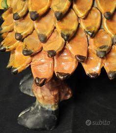 La superficie è riccamente rivestita da applicazioni policrome a rilievo che ricordano piume o scaglie decorative da toni caldi della terra – ocra, bruni e neri