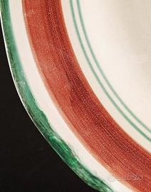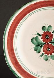 Decoro centrale floreale nei toni del rosso mattone, verde e sfumature seppia, con doppia filettatura concentrica e bordo pittorico pieno.
