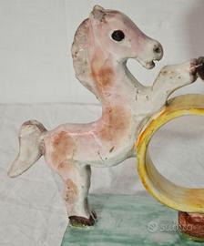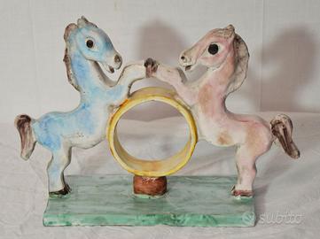 Il soggetto raffigura due cavallini rampanti affrontati, uniti da un anello centrale dorato dove è possibile inserire un orologio da tavolo.
