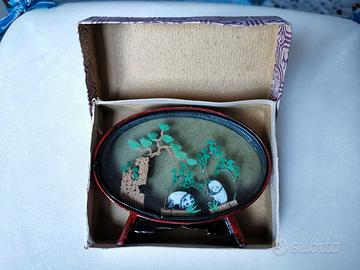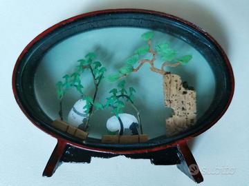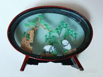 Soprammobile cinese ovale vintage con cornice in legno, all'interno sculture in sughero e due panda. Nuovo mai usato con scatola.