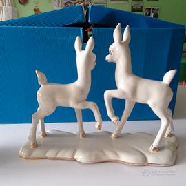 soprammobile vintage anni 50 figure di cerbiatti e cavalli con decorazioni dorate. i cavalli presentano una rottura come da foto. buone condizioni. il prezzo e comprensivo per i due articoli.